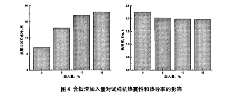 圖4所示為含鈦渣添加量對(duì)試樣抗熱震性和1000℃時(shí)熱導(dǎo)率的影響。由圖可以看出,含鈦渣的加入 明顯提高了試樣的抗熱震性,降低了試樣的熱導(dǎo)率,且隨著含鈦渣加入量的增加熱震次數(shù)呈上升趨勢、 熱導(dǎo)率呈下降趨勢。但隨著含鈦渣加入量增加,試樣的抗熱震性和熱導(dǎo)率改善趨緩,這可能是由于試樣 中雖有大量鈦酸鋁形成且量逐步增大,但試樣由于燒結(jié)好而致密化導(dǎo)致了未現(xiàn)明顯改善趨勢。