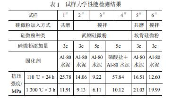 表1是以不同種類、不同添加量的硅微粉為結(jié)合劑和以磷酸鹽、Al-80水泥為固化劑的澆注料力學(xué)性能檢測結(jié)果。由表1可見,硅微粉的種類、加入方式、添加量以及固化劑種類對試樣的力學(xué)性能影響較大。由1#、2#試樣和5#、6#試樣的檢測結(jié)果可見,與硅微粉的直接攪拌加入方式相比,共磨加入方式能明顯改善澆注料的力學(xué)性能。由3#、4#試樣的檢測結(jié)果可見,固化劑種類對澆注料性能影響較大,并可看出磷酸鹽與Al-80水泥組成的復(fù)合固化劑具有明顯改善修補(bǔ)料性能的效果,而Al-80水泥則效果不明顯。由2#、3#試樣的檢測結(jié)果可見,硅微粉添加量的提高未能提高澆注料的力學(xué)性能。由采用相同的加入方式而硅微粉來源不同的1#、5#和2#、6#試樣的檢測結(jié)果可見,??瞎栉⒎叟c武鋼硅微粉相比,能明顯改善澆注料熱處理后的力學(xué)性能,并且添加??瞎栉⒎鄣臐沧⒘峡箟簭?qiáng)度隨試樣的熱處理溫度的提高而不斷增大。綜合可見,宜采用埃肯硅微粉作為鎂質(zhì)澆注料的結(jié)合劑,合適的添加量應(yīng)為3c%左右。