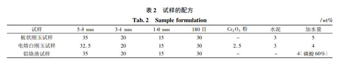 實(shí)驗(yàn)用主要原料有板狀剛玉( 5 ~ 3 mm、3 ~ 1 mm、1 ~ 0 mm 和≤0. 088 mm) 、電熔白剛玉( 5 ~ 3 mm、3 ~ 1 mm、1 ~ 0 mm 和≤ 0. 088 mm) 、鋁鉻渣( 5 ~ 3 mm 、3 ~ 1 mm、1 ~ 0 mm 和≤ 0. 088 mm) 、純鋁酸鈣水泥( Secar 71) 、磷酸溶液( 濃度 60% ) 和工業(yè)鉻綠。板狀剛玉體積密度 5. 53 ~ 5. 57 g·cm - 3,吸水率為 1. 0% ~ 1. 09% ,顯氣孔率約 4. 1% ~ 4. 8% ; 電熔白剛玉體積密度 3. 54 ~ 3. 70 g·cm - 3,吸水率為 2. 43% ~ 2. 58% , 顆粒料的顯氣孔率約 6. 1% ~ 7. 4% ; 鋁鉻渣顆粒體積密度為3. 29 ~ 3. 37 g·cm - 3,吸水率為 4. 2% ~ 4. 6% , 顯氣孔率 10. 3% ~ 12. 1% 。原料的化學(xué)組成見(jiàn)表 1。