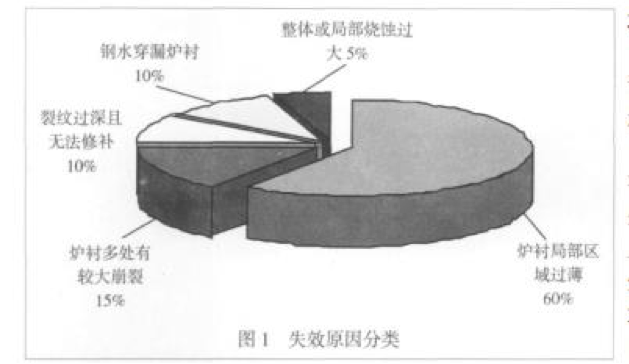 柳工機(jī)械股份有限公司鑄鋼廠每年熔煉鑄鋼鋼 液約 16000t,使用 6t 中頻爐和 3t 電弧爐熔煉碳鋼。長期以來中頻爐使用一家知名的爐襯材 料供應(yīng)商提供的爐襯材料,但一直存在著中頻電爐爐襯壽命 偏短的問題,平均爐襯壽命約 45 爐。爐襯壽命偏短 導(dǎo)致頻繁的修筑爐襯和烘爐,對生產(chǎn)組織和成本控 制都帶來了很不利的影響。為了解決這個(gè)問題,從 2008 年 6 月開始,我們開始在延長爐襯壽命方面進(jìn) 行探索。我們首先進(jìn)行了中頻爐煉鋼爐襯的失效原 因分析。 根據(jù)對 2008 年全年筑爐 25 次的失效統(tǒng)計(jì),目 前的中頻電爐爐襯材料最主要缺點(diǎn)是裂紋傾向大,爐襯容易 因裂紋而導(dǎo)致多處崩裂、造成局部區(qū)域過薄而失效; 其次是中頻電爐爐襯下部燒蝕過快導(dǎo)致爐襯失效。失效原因 分類見圖 1。