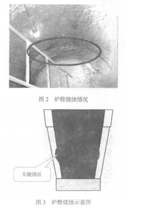 2009 年 2 月,我們與一家知名的爐襯材料供應(yīng) 商共同按照我們提出的性能要求選擇了一種爐襯材 料并進(jìn)行首次工藝試驗(yàn)。首次試驗(yàn)爐襯壽命為 40 爐次,未達(dá)到 預(yù)期要求。分析原因?yàn)闋t膛中下部局部燒蝕 過大造成失效,如圖 2、圖 3 所示。 從試驗(yàn)后拆爐過程看,爐襯整體未發(fā)現(xiàn) 有大的裂紋和崩裂。這說明這種爐襯材料產(chǎn) 生裂紋的傾向性很小,安全性較好。爐襯的 上部和爐底損壞較??;但是在爐身中下部, 爐身 1/3 高度上有明顯的較大燒蝕區(qū).